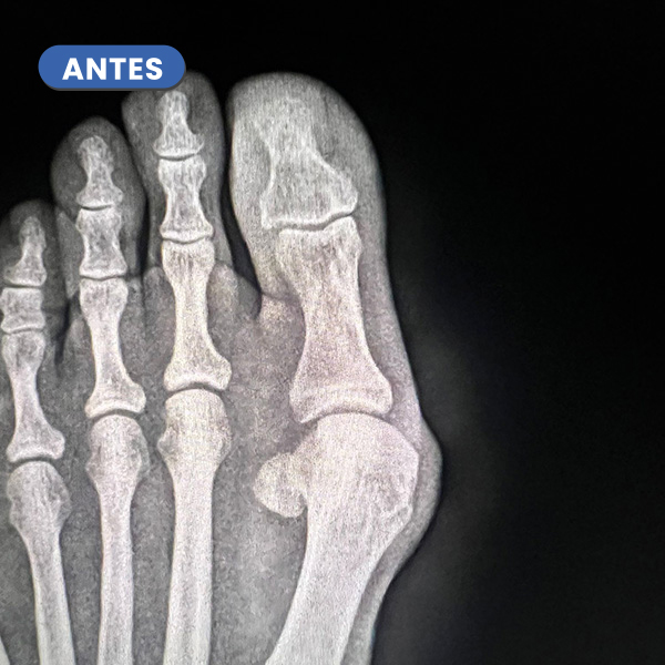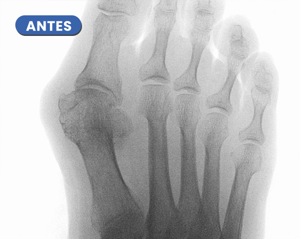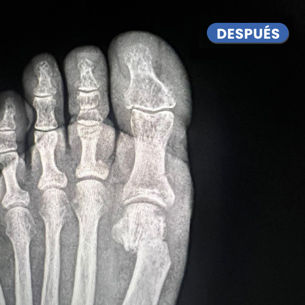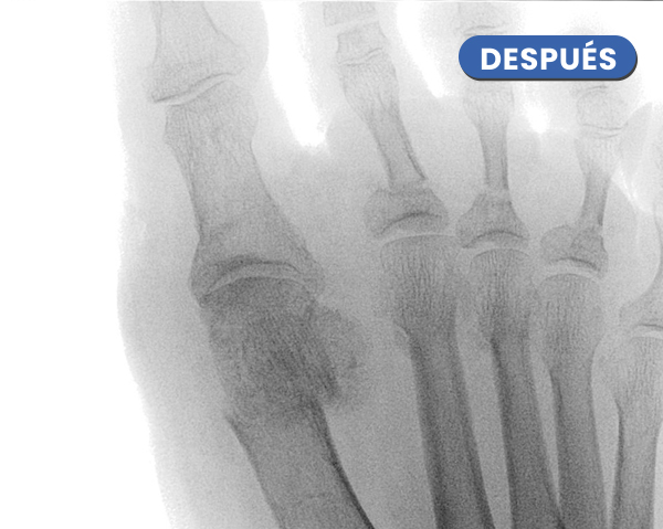 La Radiografía presenta el antes y el después a los 20 días del control radiológico tras la cura. Se aprecia la evolución en la consolidación ósea y la corrección de la articulación del hallux.